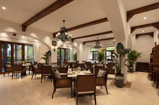 西班牙风格的别墅型酒店,环境浪漫美丽,服务保留了传统星级酒店的服务,到了有迎宾帮忙拿行李,前台雪莉和小婷热情洋溢,服务温馨,服务生送行李到房间,倍感温暖。酒店还有小型影院可观影,下午场4点 ,是适合小朋友的动画片,晚上7点是适合成年人的影片。酒店内中餐厅出品很有品质,还可以提供自带海鲜加工,个人认为比外面的店更有品质保障。