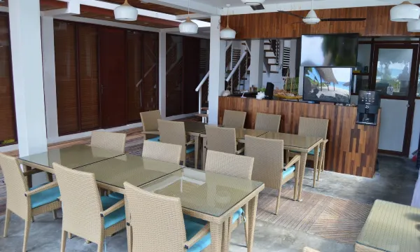 酒店就在面向码头的左手边位置很方便,然后是小木屋的形式,进去酒店是需要脱鞋的,在酒店的旁边就是餐厅,然后工作人员可以帮忙订从富力度到马累的船,第2天早上6:45出发。