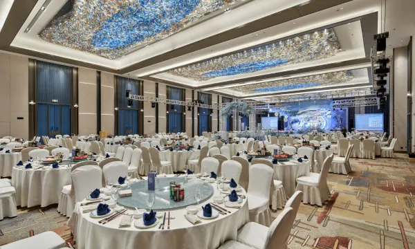 酒店建筑面积8.3万方,总投资7亿元,拥有各式客房,房间视野开阔,俯瞰瓯海全景,房内装修豪华、雅致温馨、配套齐全。酒店裙楼共有近6000平的大小宴会厅,可同时容纳5000多人用餐,其中有可容纳70桌的无柱宴会厅,是您婚礼宴会的优选。酒店还设有商务会议室,SPA 、健身房、180度景观恒温泳池、精品店,各种豪华配置给您提供不一样的入住体验。
