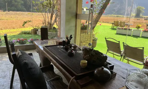 第一天入住赶上下雨,房间内可以欣赏到仙气飘飘对面山峦和稻田的景色。第三天离店大晴天了,楼下的三角梅更是争鲜斗艳,美的哇塞。就环境而言推荐。隔壁还可以点餐,家常菜也算便捷。