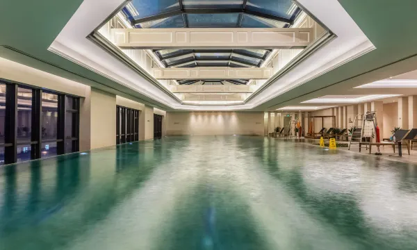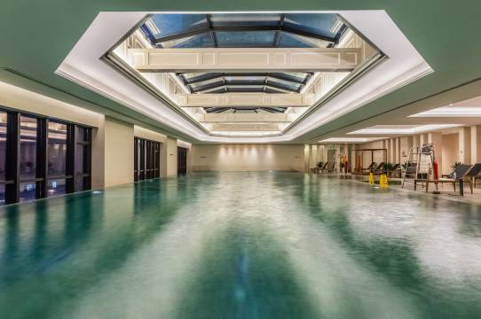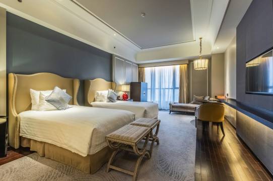 客房宽敞,布置温馨雅致,均配备宽大的落地窗和窗边沙发,还有PM2.5空气净化系统。盥洗室装潢精美,使用大理石瓷砖和水晶灯饰。此外,酒店还设有室内泳池、儿童乐园、健身房、棋牌室等丰富的康乐设施。