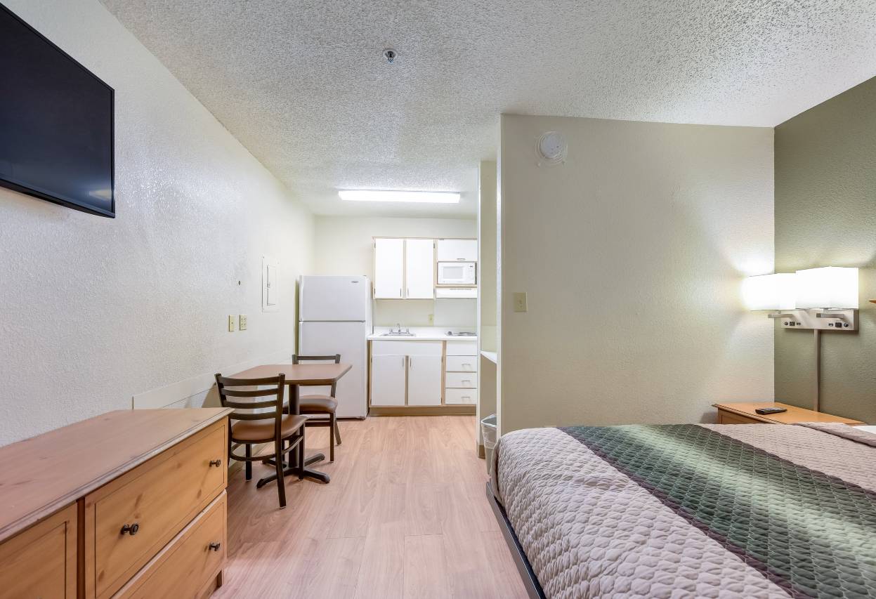 有 120 间客房提供备有大冰箱和炉灶的简易厨房;您定能在旅途中找到家的舒适。带有有线频道的 32 英寸平板电视可满足您的娱乐需求;同时提供免费无线网络,方便您与朋友保持联系。便利设施包括微波炉,以及带有免费市内通话的电话。
