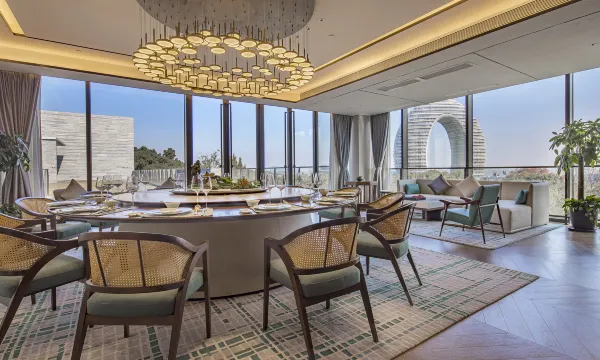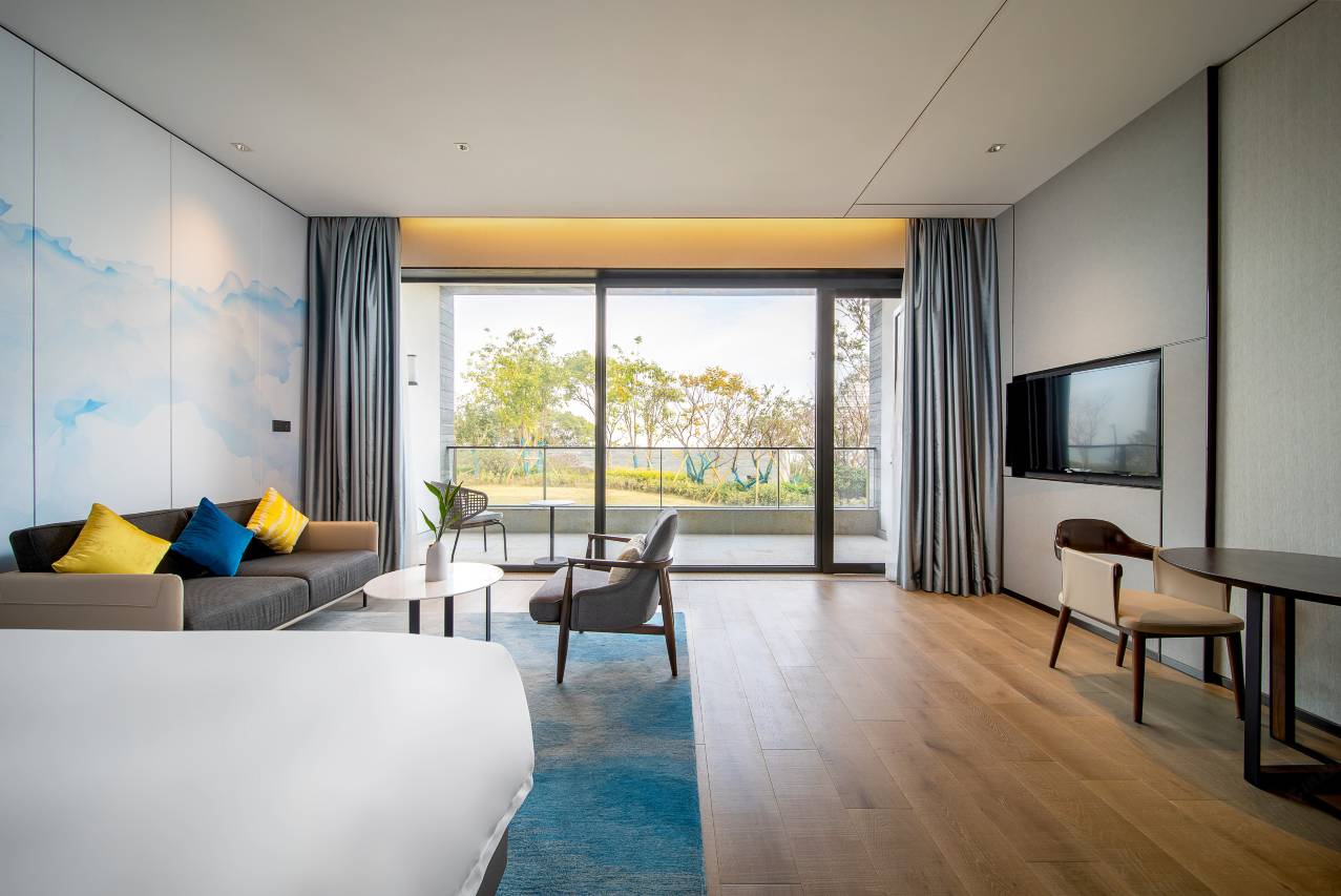 我们定的房型能直接看到对面的地标建筑,晚上亮灯很好看。房间周围绿植环绕,鸟鸣清脆,非常舒心。房间的装潢是现代风,空间很大,个人特别喜欢洗手间明亮度够高,化妆可以不用补光灯。还有消毒柜放杯子很安心,整体也很干净。