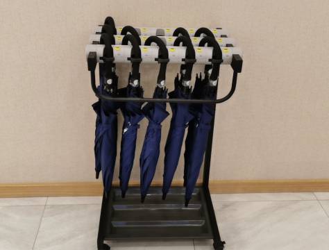 大堂明亮态度优,一旁美酒几层摞