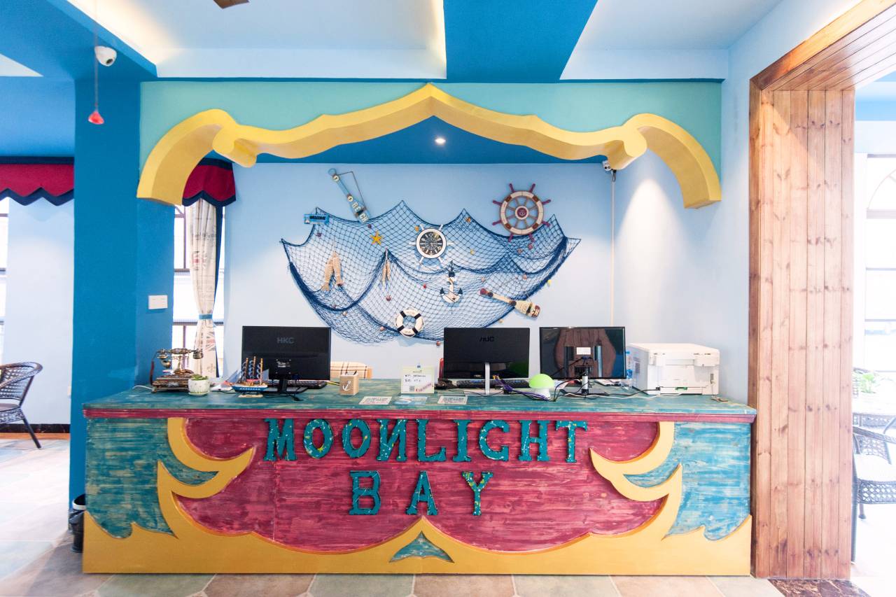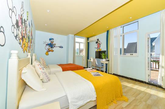 老板很好 看我们带着孩子 给我们升级房间 本来是一个大床亲子主题房间 在一个大别墅里 还有一个大游泳池 出门整条街几乎是吃饭的地方 交通方便 走出别墅 走几分钟就到了银海滩 价格亲民