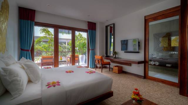 位置闹中取静,一楼的泳池房很大很大,双床房就是加了一张活动床,只不过门是整面墙的落地窗,别人会经过和坐在你门口,隐私性不太好。服务很热情,前台有个叫福利的小男孩会说中文,尤其热情.酒店的spa一定要体验,超级好,比在外面花几十美元的都要舒适,环境优雅!早餐略简单。