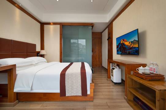 中文.酒店设计精致:大厅有非遗传承人亲手绘制的唐卡、有藏文化标志性的“八宝图案”、转jing筒,吉祥图,酒店有不同房型让客人选择,有观看蓝天的星空房、阁楼房;还有打开房门就可看布达拉宫的观景房。精致的装饰和布局,让您不仅感受到浓郁的藏文化,也能感受到店里细致温馨的服务。在酒店四楼的观景清吧,要一杯甜茶,布达拉宫近在咫尺;色拉寺、色拉乌孜、帕邦卡、曲桑寺、米琼日寺等景点尽收眼底。酒店配有地下车库,电梯,房间配备了供氧、地暖、空调、加湿器,24小时热水、WiFi全覆盖.