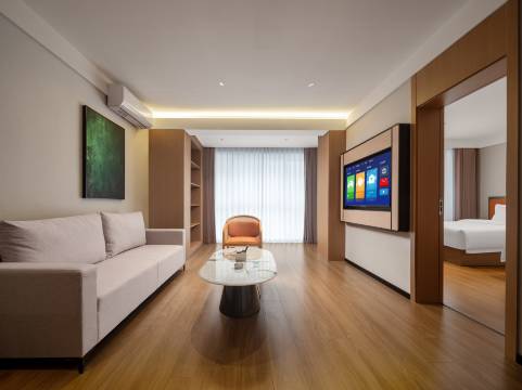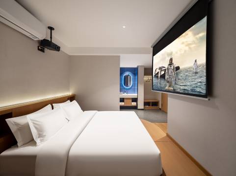 房间真的很不错!空间宽敞干净 床品舒服 采光也很好 投影很高清 酒店前台服务好很热情 位置就在万达广场旁边 吃饭逛街都超方便 性价比很高 强烈推荐!