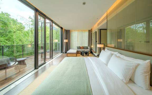 酒店藏在竹林山野间,63栋别墅依山傍水,推窗即是茂林修竹与湖光山色,灰白主调的内饰透着东方禅意,地暖与智能马桶的配置让雅致中满是贴心。最喜欢清晨在江畔步道慢跑,呼吸着负氧离子充裕的清新空气,或是午后在临湖茶室“茶觉”品茗,看光影透过竹影洒落,时光都变得慢悠悠。接待我们的礼士橙子服务细致周到热情,回复及时,很不错的体验。