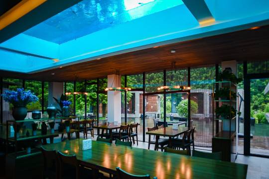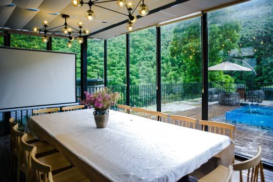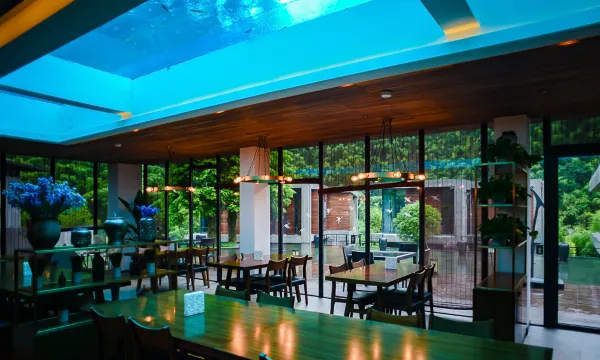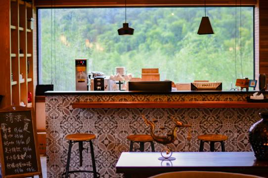 这是一座在山野之上明亮生长的度假酒店,位于莫干山北麓,占地20多亩。阳光咖啡吧、水下餐厅、会议室,多功能影音活动室,棋牌室,乒乓球桌,户外临溪平台,10多亩的大草坪,可以做各类户外团建,依茶而座的空中露台,绿树、竹山、茶园、石墙、静水,组成了这片不可多得的磬心之地。