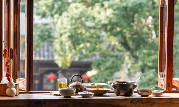 在住宿前一天老板娘就提前联系了我们,预订好摆渡船接我们进住。民宿环境优雅别致,一进店迎接我们的是准备好的下午茶。房间不大,但很温馨,窗外就是古镇美景。民宿就在百间楼,离其他景点很近,游览很方便。临走前赶上了台风,下雨天坐在窗前,泡上一壶茶,和好友聊天,一点儿也没影响心情。下午雨小后打着伞走在烟雨朦胧中的古镇街道,那感觉太美了!