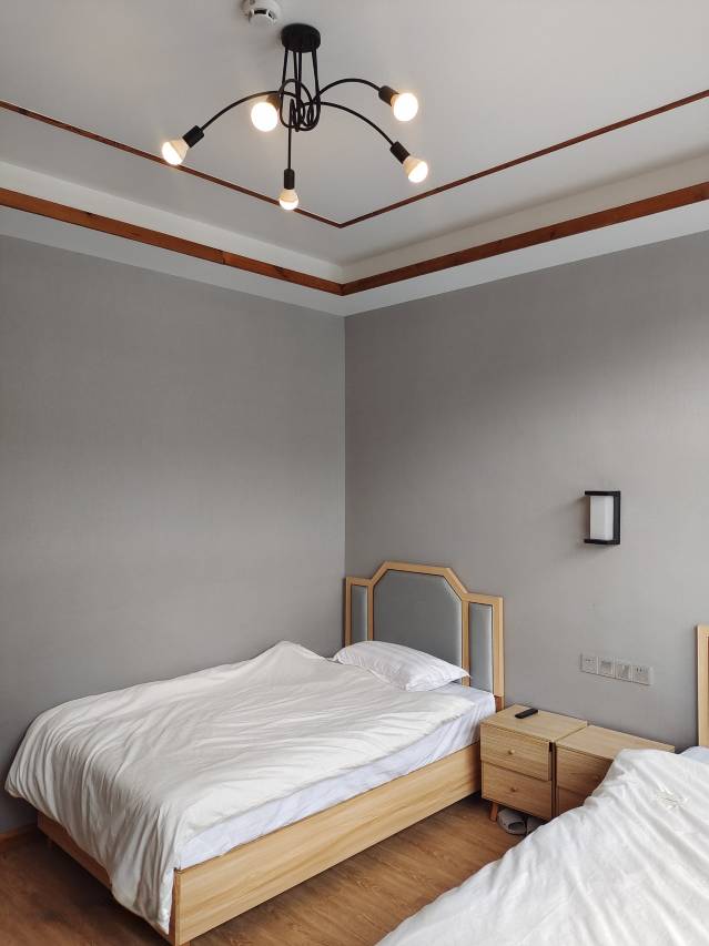 酒店是新中式风格的,中央空调,空气能,wifi,可以唱歌,打麻将,位于诗人小镇内,旁边是停车场,可以停大巴。