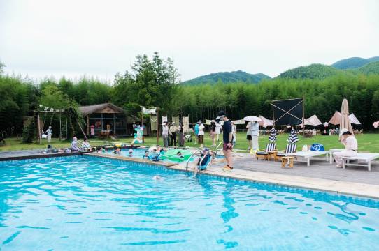 2、室外的游泳池孩子们玩到很晚都不腻,民宿后门直接出去就是双溪特别方便。 一会泳池一会溪水,可太开心啦🥳