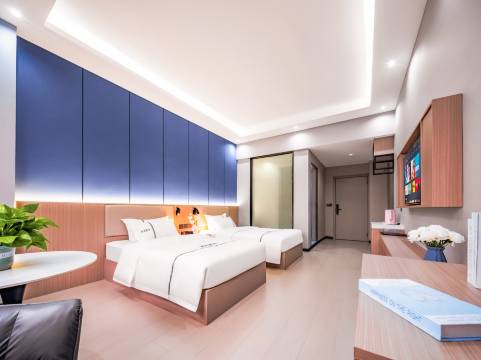 酒店是在弥阳街十字路口位置很显眼,房间设计规划合理,设施齐全,房间分内外侧,内侧靠较安静,外侧靠马路,房间装修设施齐全,环境保持较好,卫生保持正常,房间环境新装修不久,设施齐全,智能语音控制窗帘,灯光,空调,房间宽敞较大合适,住着舒适。楼下附近有公交站点,吃饭要走一站路庆来公园那边方便,距离市中心有两站地距离,性价比高卫生设施都不错,唯一不足就是看电视要收费。