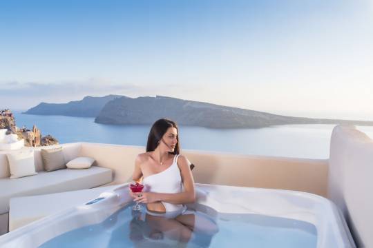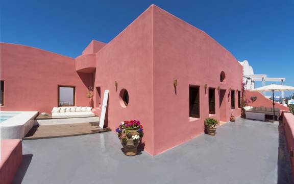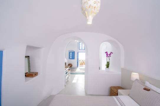 这间套房观日落的位置非常好。几乎就在最前面几排,没有杂物遮挡。套房有好几个阳台,可以看到蓝顶教堂。房东很热情,安排了接送机,价格合理,也方便快速找到酒店位置。洗浴用品和一次性拖鞋都有提供。房东很热情,提供的旅游餐饮建议也方便了我们,家人很满意。就是木门隔音不大好,圣托里尼房租拱形顶的设计也有扩音效果,不是特别安静。有些厨具电器有些老旧,建议维修一下。