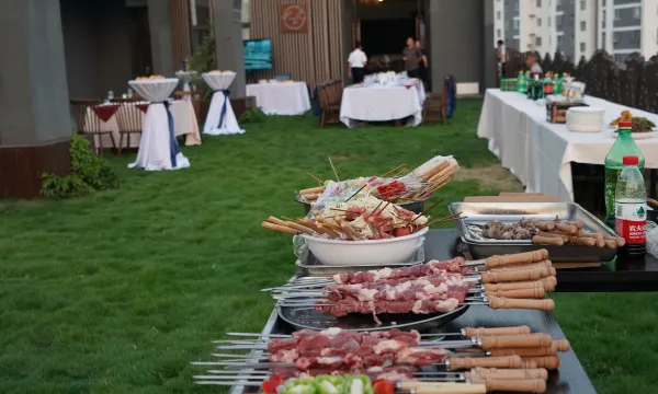 易县一家大型文化主题商务酒店,深植千年易水砚文脉底蕴,集高端住宿、精品餐饮、多元会议培训、盛大喜庆宴会、西式珍馐、格调酒吧、屋顶露天婚礼花园于一体,更与易县博物馆、易砚博物馆无缝相融,让文化雅韵与旅居体验完美共生。 雅致居停 坐拥9间奢阔豪华套房、9间温馨大床房及107间舒朗标准房,客房以人文美学为骨、现代奢适为肌,细节处暗藏匠心巧思,为商旅宾客构筑静谧尊崇的休憩秘境。 宴饮盛境 配备多间豪华包房与多功能宴会厅,规模多元适配全场景需求:可容纳300人的恢弘宴会厅1个、120人精致宴会厅3个,从容承接大型婚宴、庆典盛宴;另有4桌小型聚会专属包间1个、14-16人尊享大包1个、18-20人豪华大包1个、10-12人雅致包房10个,满足商务宴请、亲友欢聚等不同场景;150人自助餐厅珍馐荟萃、氛围雅致,无论是商务酒会、浪漫婚宴还是主题派对,皆能以专业服务铸就舌尖美味与仪式感的双重盛宴。会务标杆,拥有周全商务设施与专业会务团队,会议空间灵活高效:可容纳500人的大型会议厅气势恢宏,150人中会议厅功能完备,50人小型会议厅静谧专注,30人领导接待室庄重典雅,适配商务会议、培训研讨、政务接待等各类活动,全程护航保障圆满高效。 休闲雅趣,酒店内设健身房、KTV、茶室、咖啡厅等休闲配套,运动焕活身心、欢歌释放心绪、品茗沉淀时光、悠然小酌叙情,随心切换惬意模式,为商旅休憩与闲暇时光注入雅致韵味。