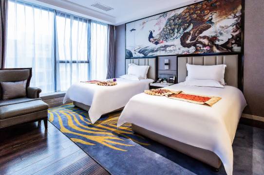 酒店采用新中式装修风格,格调高雅、卫生干净、舒适豪华,采用落地窗设计,风格新颖,配套设施一流,数字化液晶电视、智能电动窗帘、记忆橡胶床垫,人体感应照明设计,卫生间干湿分离,高档精品TOTO洁具以及空气净化器的配置。
