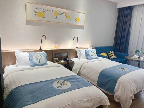 宽敞走廊里孕育着柚元素的装饰柱及柚香味,房间夜间有赠送木糖醇柚子银耳羹和欢迎词、柚子型的折花、夜床服务,还可以免费体验自助洗衣、健身瑜伽、儿童乐园、电子高尔夫或卡拉OK。