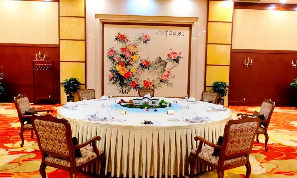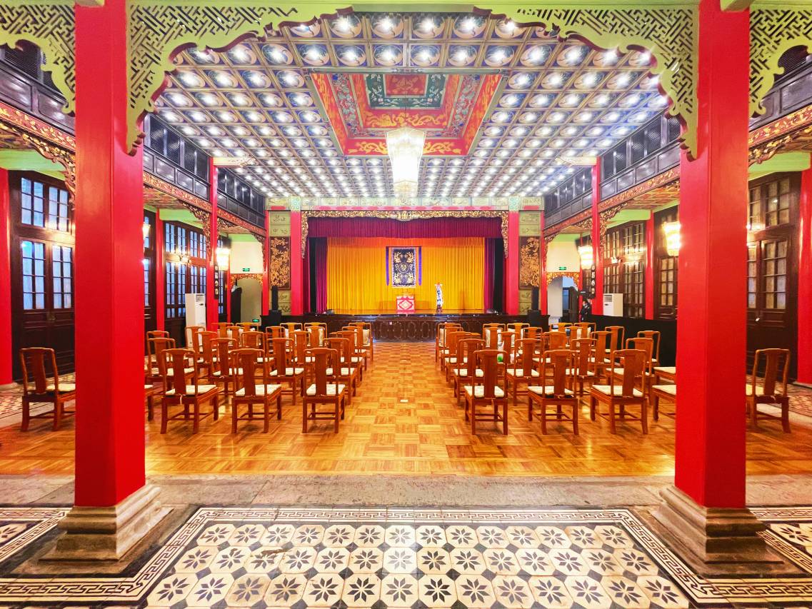 云南震庄迎宾馆文保建筑绣楼,原为观赏戏曲演出的地方,又是另一番经典设计,现在已改为会议使用。典型的中式风格,红底金龙图案藻井之下悬挂的六边圆柱宫灯,雕梁画柱的木结构风格,搭配雕花木屏风及花山,古典尊贵之风溶于其中。回忆历史沧桑,感受非同一般,实为会议首选之地。