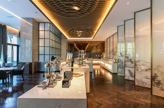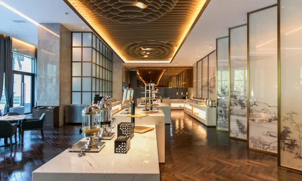 餐厅位于一层酒店大堂旁,使用面积359平米,可同时容纳130位客人用餐。餐厅供应中西式自助餐品,同时在午后时光提供精致下午茶。