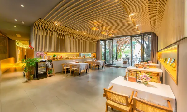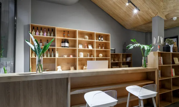 这家民宿的设计感真的让人眼前一亮。整体是新中式与日式侘寂风的融合,大量运用原木、竹编和石材,营造出一种自然、质朴又不失雅致的氛围。从天花板的流线型木格栅,到前台的竹制屏风,再到随处可见的花艺摆件,每一处细节都透着主人的用心。公共空间宽敞明亮,桌椅摆放舒适,无论是独自发呆还是好友小聚,都非常惬意。