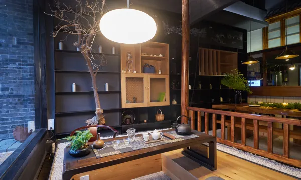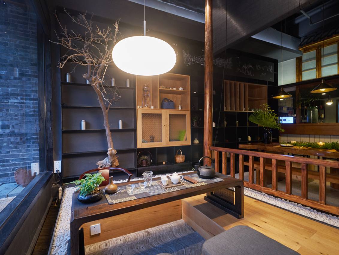 入户便是跃然于眼的娟娟水流和静溢枯山水,拾阶而入,黑钢和木搭配而成的阶梯式座椅让人眼前一亮,颇具古意的吧台和茶座以及被流水环绕的开放式茶室相呼应,多种元素完美地融合于一厅之内。
