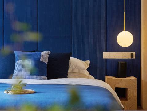 木食•老湖州城市民宿采用了全智能化家具设计,进门只要打声招呼,贴心智能管家“小爱同学”便会为你打开窗户和灯。智能家具连接着所有的灯光、窗帘窗纱、音响和投影设备,无需动手找开关,轻轻张嘴,便能控制全屋。