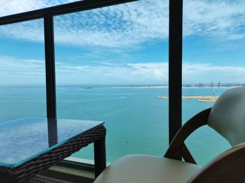 对此次入住非常满意,卧室和阳台都可看海,到的时候刚好是傍晚,晚霞很美,周边购物吃喝都方便,房间设施齐全,冰箱、电视、洗衣机等等都齐全。