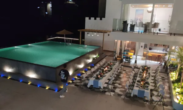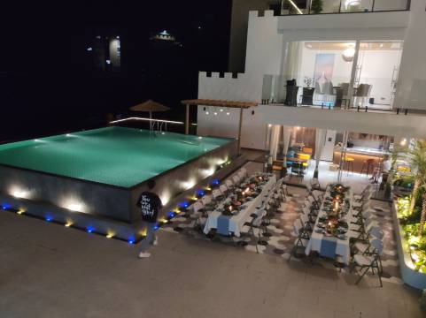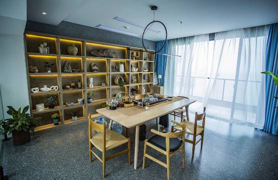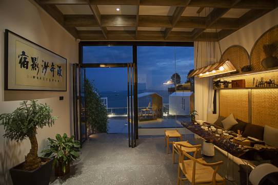 整个项目占地面积约790㎡,建筑使用面积高达2200㎡,只设计了14个房间,通过设计手法将感知空间放大、将时间放缓、将空间类型做丰富,非常适合网红打卡拍照。影宿公共区域配有玻璃观景台、个性花茶室、新中式茶室、阅览室、会客室、投影区、微酒吧、240°海景餐厅、网红泳池以及两个超大露台,大露台面积分别约为400㎡和260㎡,可用于承接户外婚礼、公司团建、生日party 、婚纱写真摄影等商务活动。