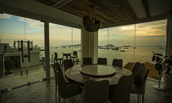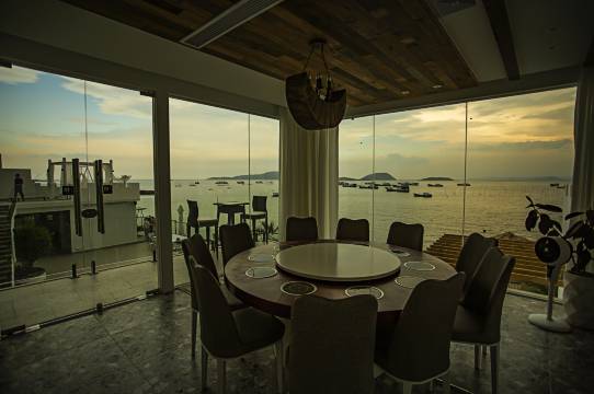 因为前面是在修的沿海公路,所以只能从北边进,门头看上去小小的,不太起眼,我们刚到的时候都开过头了,但是进去以后,真的是豁然开朗,基本每个房间都是面朝大海的,每一层还有一个茶室,要是几家一起去的,晚上还有地方可以小聚一下