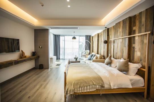 老板免费升级了房间,介绍了游览攻略,推荐的海鲜大排档味道超级棒。民宿设计感强,每一层公共区域有不同特点,四层有玻璃观景台、小秋千、聊天观景区,三层有品茗、读书区,二层有个小吧台,一层有小泳池,小朋友会喜欢。入住的带露台的房间,卫浴三分离,十分方便,房间布置简约、慵懒、舒适。躺着露台的吊床吹着海风、看着海景,闲适、恬静、惬意……