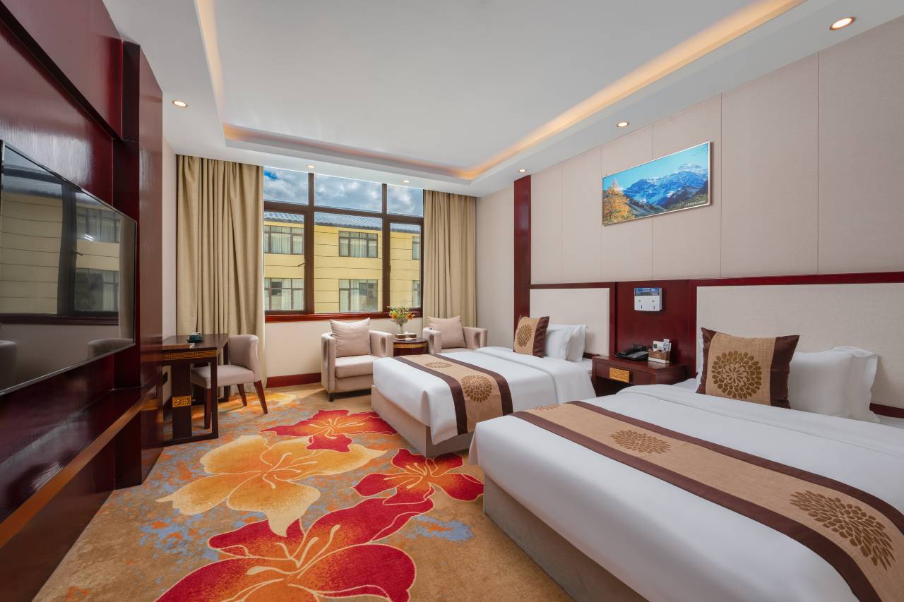 有弥散式氧气,有暖气,房间和床都是比较大的,有早餐,对得起这个价格,服务员有求必应,态度好,中式装修。稍显旧,团队多,距离川主寺稍远,要开车去。对面风景很好,有高原草场的感觉。性价比高。