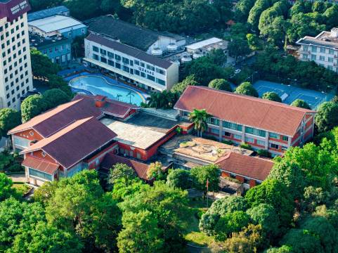 饭店占地面积约11万平方米,绿化率高达51%以上,饭店内果木翠竹、鸟语花香、极具南国风情。