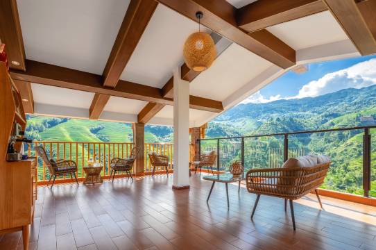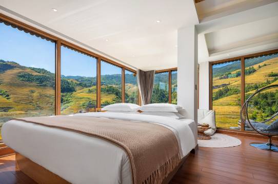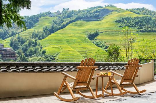 民宿整栋建筑外观保持红瑶族特色吊脚楼,以花园庭院,晚风阳台以及星空露台餐厅为主线的设计思路,可以为您带来晚风轻拂,璀璨星空以及绝美青山梯田的极佳体验。客房装修独特,舒适美观,大多以全景大落地窗为设计主线,引景入室,较大限度的将窗外梯田画卷与客房融为一体,使人在室内也感觉置身梯田间。整个院子有亲子套间,特色双床,私密大床,同时也预留了超级宽阔的公共空间,1楼花园庭院与露台餐厅配有休闲摇椅,休闲茶亭,最最棒的是酒店在楼顶舍弃了40平方观景最棒的房间用来做观景休闲吧,还配有茶泡工具,如果不想出门爬山,便可在观景休闲吧、一楼院子里呆上一整天。坐着摇椅,泡壶茶,慢慢聊天也非常惬意啊。