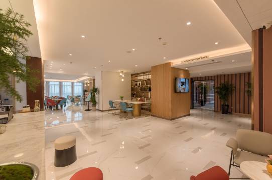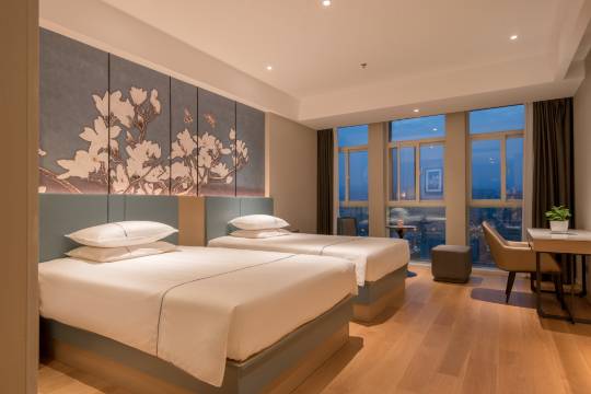 房间宽大洁净,很干净,位置很好,商业区什么都有,旁边就是瑞幸咖啡,周边环境好,设施新,面包店咖啡店海底捞超市商场都在这里,服务人员也都不错,服务到位。这里位于新区和老区的交界处,到哪里都很方便。离高铁站特别近,酒店门口一直有出租车,随到随走。