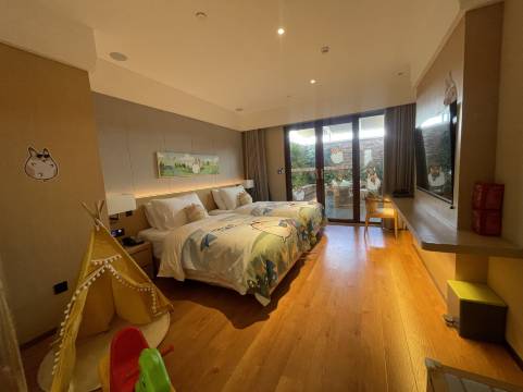 干净卫生,有个小院特别舒服,如果跟朋友一起来玩的话在小院里聊天吃零食非常不错👍细节处也很好,送行李服务,洗手间有特别的小朋友脚凳,还有LED化妆镜,还有熨烫衣服的,非常棒的入住体验。就在龙凤山庄脚下,晚上的水上乐园小朋友玩得很开心,晚上灯光秀也不错,第二天去山庄玩游乐设施,小朋友玩得很尽兴。