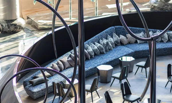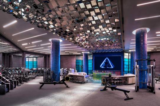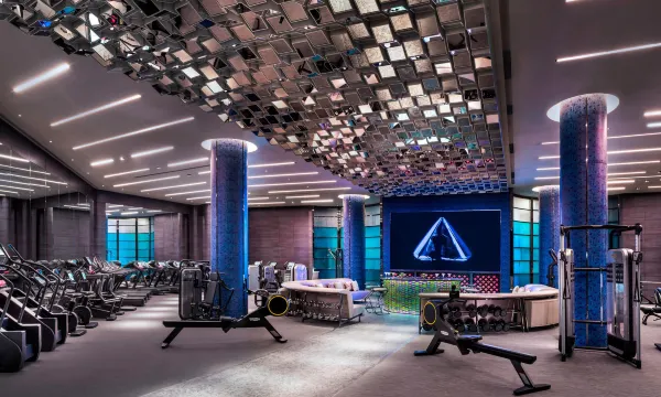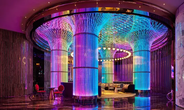 西安W酒店把潮流与古都韵味玩出了新高度。进门就是沉浸式3D光影隧道,蓝紫色光效科技感拉满,瞬间切换到赛博氛围;中庭的螺旋艺术装置与攀爬者雕塑充满张力,现代设计感十足。