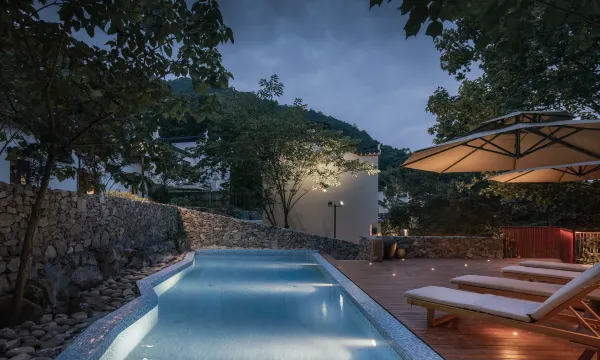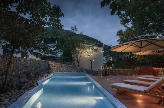 大乐之野·南洞(舟山定海店)位于舟山定海区干览镇新建村,白墙黛瓦,小桥流水,黑白的配色,中国院落与江南园林巧妙地融合。小溪从高处流下,穿过整个院子,把活力和清新留了下来。独栋院落依山而建,每一栋都以定海的地名命名,古朴传统,酒店配备野有食餐厅、咖啡馆、野有集小卖铺以及戏水池等。