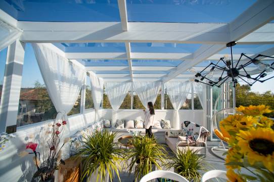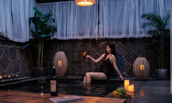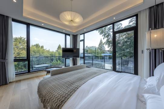 别墅地处于莫干山高峰村,交通便利,距离庾村九分钟路程,云也大隐于市,背靠竹林环境清幽,闹中取静的神仙去处,纯白色的建筑,现代极简ins风的设计,白与绿的小清新感,度假风十足超大的透明泳池,两旁的棕榈树,让人有种身处海岛度假的即视感,闯入东南亚巴厘岛,碧海蓝天,椰林丛生整体房间数量不多,但每个房间都很大,床品也是高星级酒店配置,舒适简洁又有美感,摩洛哥风的设计,纯白的纱缦,少女心满满,都带有超大的露台,目光所及都是绿意,坐在喝茶聊天惬意的生活,一楼的房间推开门就能看到泳池,晚上躺在浴缸洗去疲乏二楼的公区也很大,可以在摇椅上坐看云卷云舒,还有烧烤区,露台,情侣出游公司团建都很适合