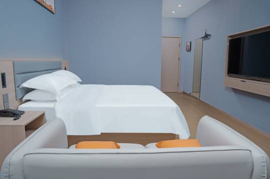 我经常出差,这个酒店的价位还是挺对得起这个房间的,房间的配套设施很齐全,虽然是新装修的,但房间并没有什么异味,主要是房间的床挺舒服的,房间提供了四个枕头,完美的解决了我喜欢看电视靠背的问题,而且两个枕头的软硬度还不一样,睡觉的时候可以根据自己的喜好进行调整,细节还是挺多的,很有品味的一个酒店,出差首选。