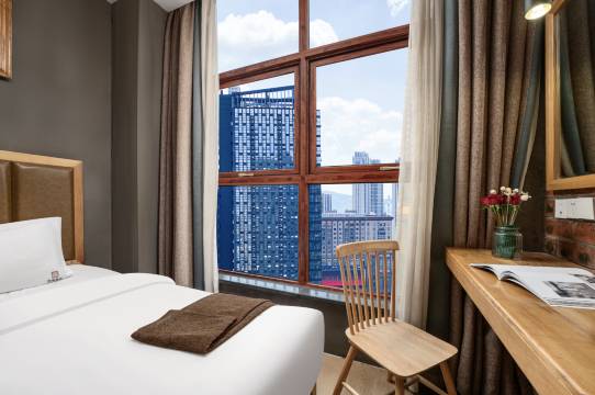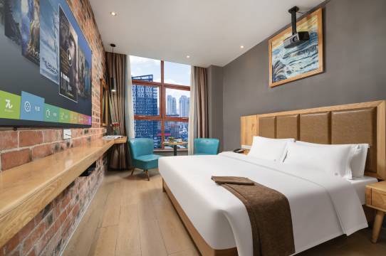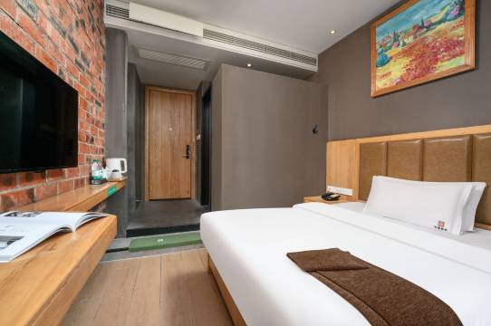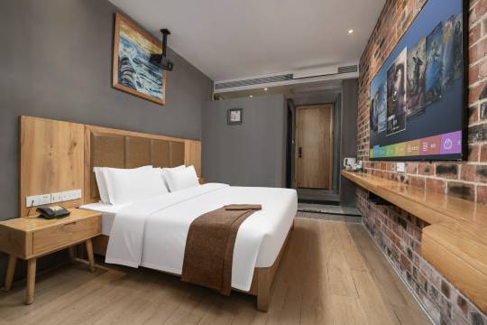 房间的床舒适,床单被套盖着舒服,房间卫生很干净,还有洗衣房,前台服务真的很好,酒店还有免费的停车场,工业风装修风格,纯天然轻奢,红砖电视墙新颖而别致。落地窗明亮,帘新幽梦,五楼居卧,睡梦沉香🌹 🌹