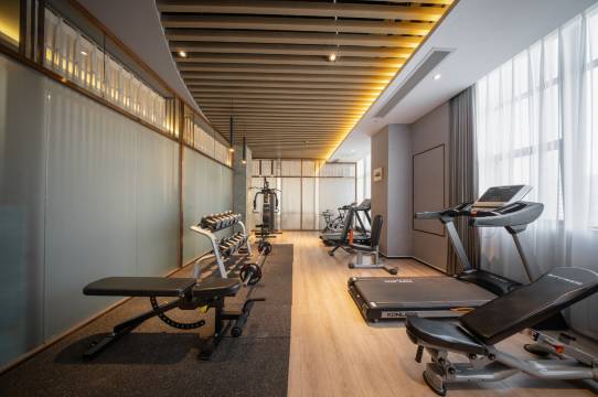 健身房里设施齐全,有跑步机,龙门架,哑铃,自行车。
