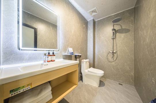 新装修的。整体简约适度。这个价格在镇上也算很合理。房间挺大的。停车也方便。吃的就在楼下?性价比挺高的。
