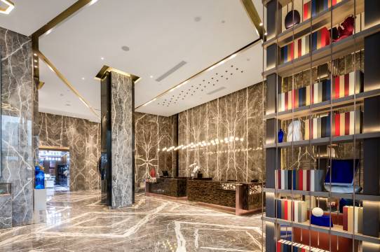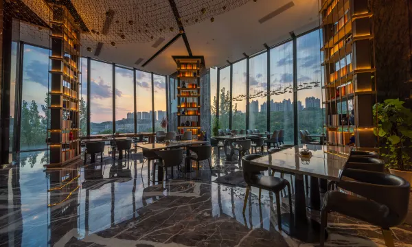 座落于渝北爱尚两江高端商业区,西临颐和高尔夫练习场,具有良好的景观视野。东临爱琴海购物中心,夜晚灯光璀璨,地处北区商圈范围,具有良好的商业价值和景观资源,交通便捷,城市繁华中的一片宁静。我们希望从高端人群的生活所需以舒适为出发点,结合居家、旅行、休闲等不同层面进行人性化思考,着力打造大堂豪华套房,餐厅等系列。酒店早餐厅也是一大亮点,270°落地窗,视野极其开阔,西式中式的结合,重庆特色饮食等。灯具采用国内一线品牌马斯登灯,洁具龙头德国当代,床垫金可儿。大堂的建筑空间我们运用精致的特殊玻璃结合水芯片的屏风及层架分出空间的段落,使狭长的大堂区域营造出不同的空间场景。大堂吧的设计延续钻石切割的处理手法,侵泻而下的发光艺术装置更是让人眼前一亮。