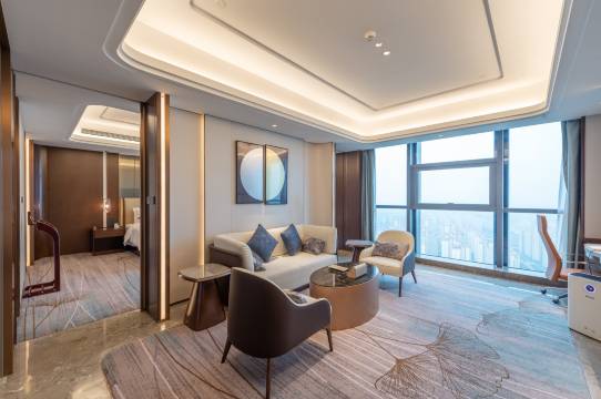 非常满意的一次入住!酒店地理位置在新区,出行便利,周边配套完善。房间空间宽敞,布局合理,落地窗视野开阔,采光良好,风景极佳,灯光温馨住着舒服。床品舒适,软硬适中,睡眠质量棒。卫浴干湿分离,热水充足,备品齐全,电器也比较高端齐全。民悦汇小喻和小康态度友好专业,服务贴心到位,让人有宾至如归的感觉。早餐也不错,吃得很香,卫生条件一流,环境优雅安静,整体体验非常棒,是出行住宿的好选择,已经推荐给朋友,以后还会再来!