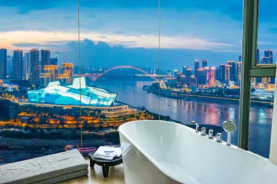 地理位置优越,房间干净,视野角度在江景房里算不错的。在房间里就可以看周六晚上的“魅力重庆”无人机灯光秀展演。房间配有一次性用品,还有冰箱洗衣机。客服提前告知地址及相关事项,服务态度好。