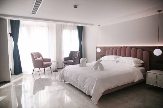 酒店为复式设计,装修设计大胆时尚简约,属于精品豪华酒店,客房布置工艺品、艺术画、智能锁控、自动窗帘、乳胶床垫、定型枕头,无论是棉质品还是客用品都采用高标配置,顿显入住尊贵!