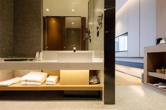 地理位置很好,紧邻万达广场,交通便利,步行就可以过去吃饭。房间宽敞设备齐全,外卖可以机器人留给送上来,服务体验很不错。房间含早餐,早餐种类很丰富,基本可以满足各类口味需求,酒店入住体验感很好,大堂简约大气,配备的热饮茶都很不错,房间干净整洁,前台的服务很热情,24小时健身和洗衣也非常方便,强烈推荐的一家酒店。酒店大厅装修的很大气,房间的设施设备也齐全很好,在大堂还有免费的下午茶,是一家性价比很高的酒店