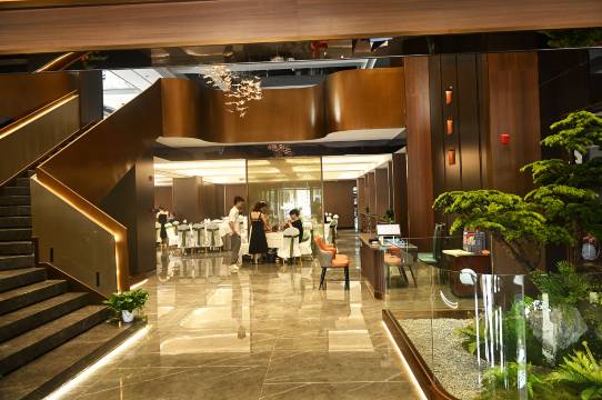 楼下是酒楼,楼上是住宿,一栋都是一起的,毕竟有酒楼,前台会比较忙,和单独的酒店前台比,多多少少会有一点差别,能理解