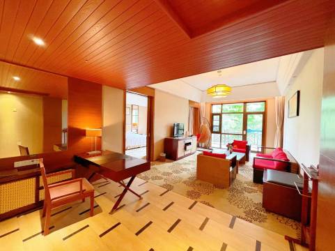 围绕圣泉湖及圣泉岛的17栋湖景别墅,古色古香。客房面积大,有独立的厨房以及温泉泡池,能自己做饭,私密泡汤。